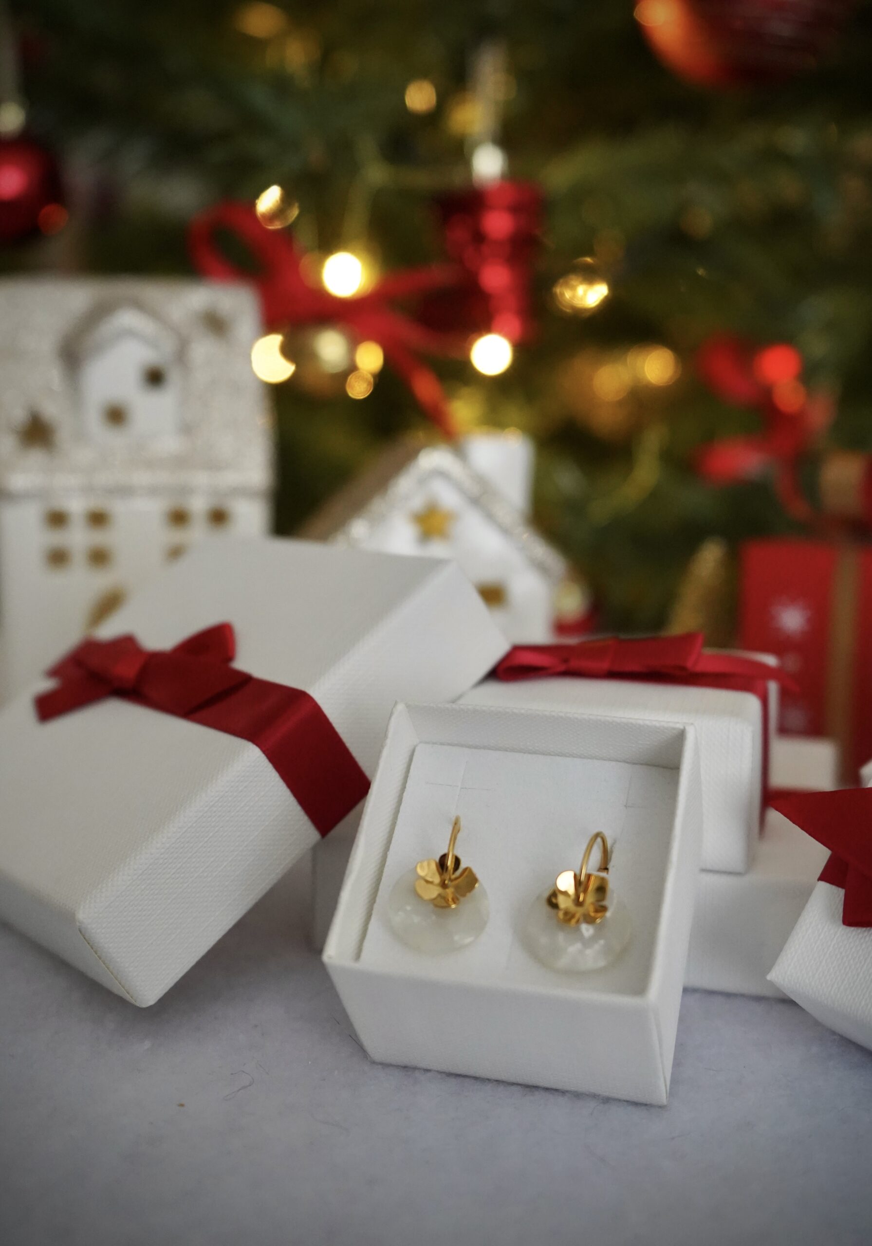 Boucles d’oreilles créoles pendantes composées d’une fleur en acier inoxydable doré et d’une pastille ronde de couleur blanche.