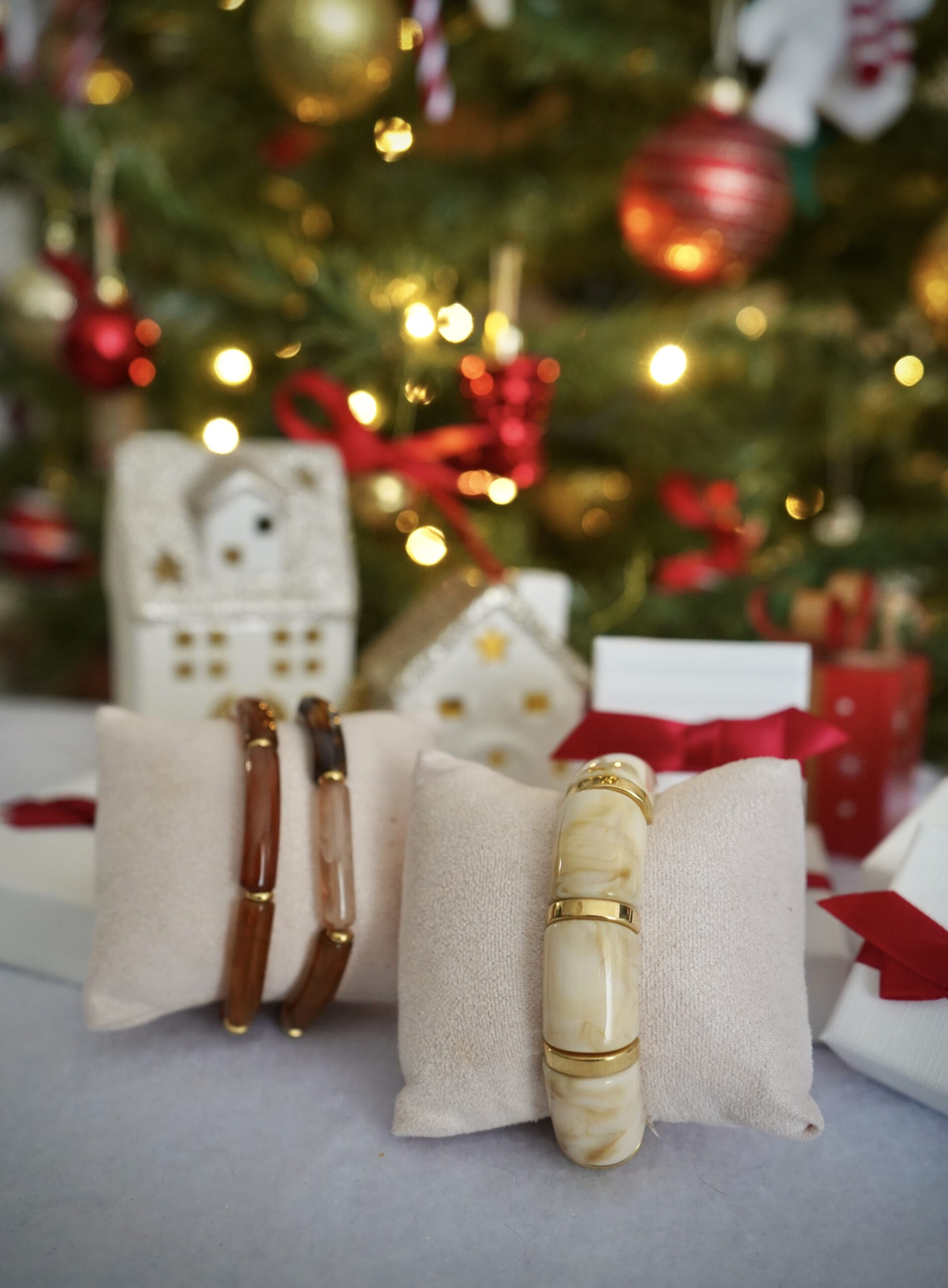 Les perles sont reliées par de délicates finitions dorées, ajoutant une touche d’éclat discret.